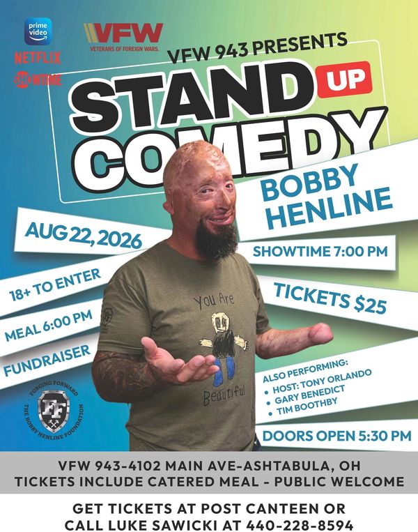 VFW 943 presents Stand Up Comedy with Bobby Henline, featuring Gary Benedict and Tim Boothby, and host Tony Orlando.