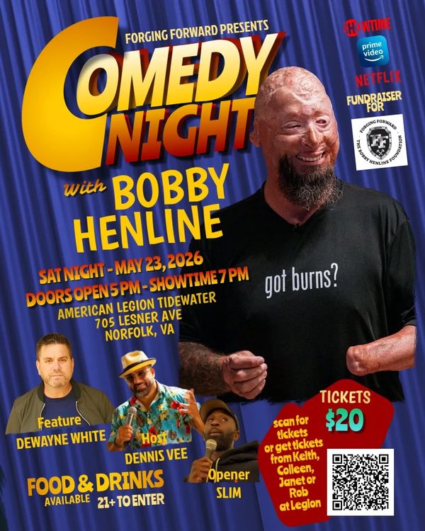 Forging Forward, The Bobby Henline Foundation and Bobby Henline Comedy present Stand Up Comedy with Bobby Henline and Friends, featuring Dewayne White, opener Slim, and host Dennis Vee.